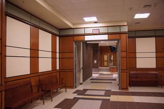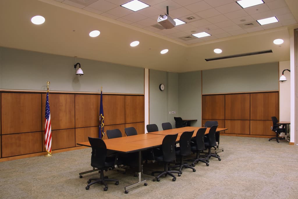 The County of Lancaster hired Greenfield Architects Ltd. to do a Master Plan for the Lancaster County Courthouse for both judicial and administrative functions. The project involved facilities review of three buildings (the existing main courthouse, a connected old courthouse, and an administrative office building at 150 N. Queen St.), approximately 50 departments, and accounted for ten years of growth. Pictured above is the Commissioners Meeting Room on the 7th floor of 150 North Queen Street.