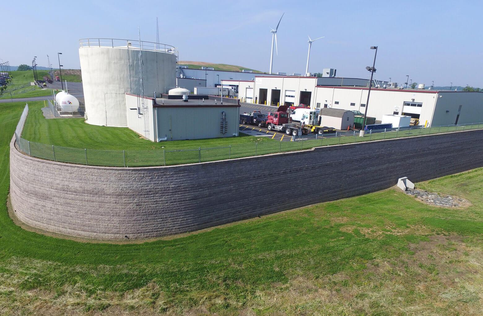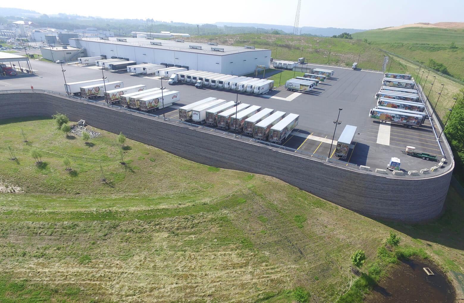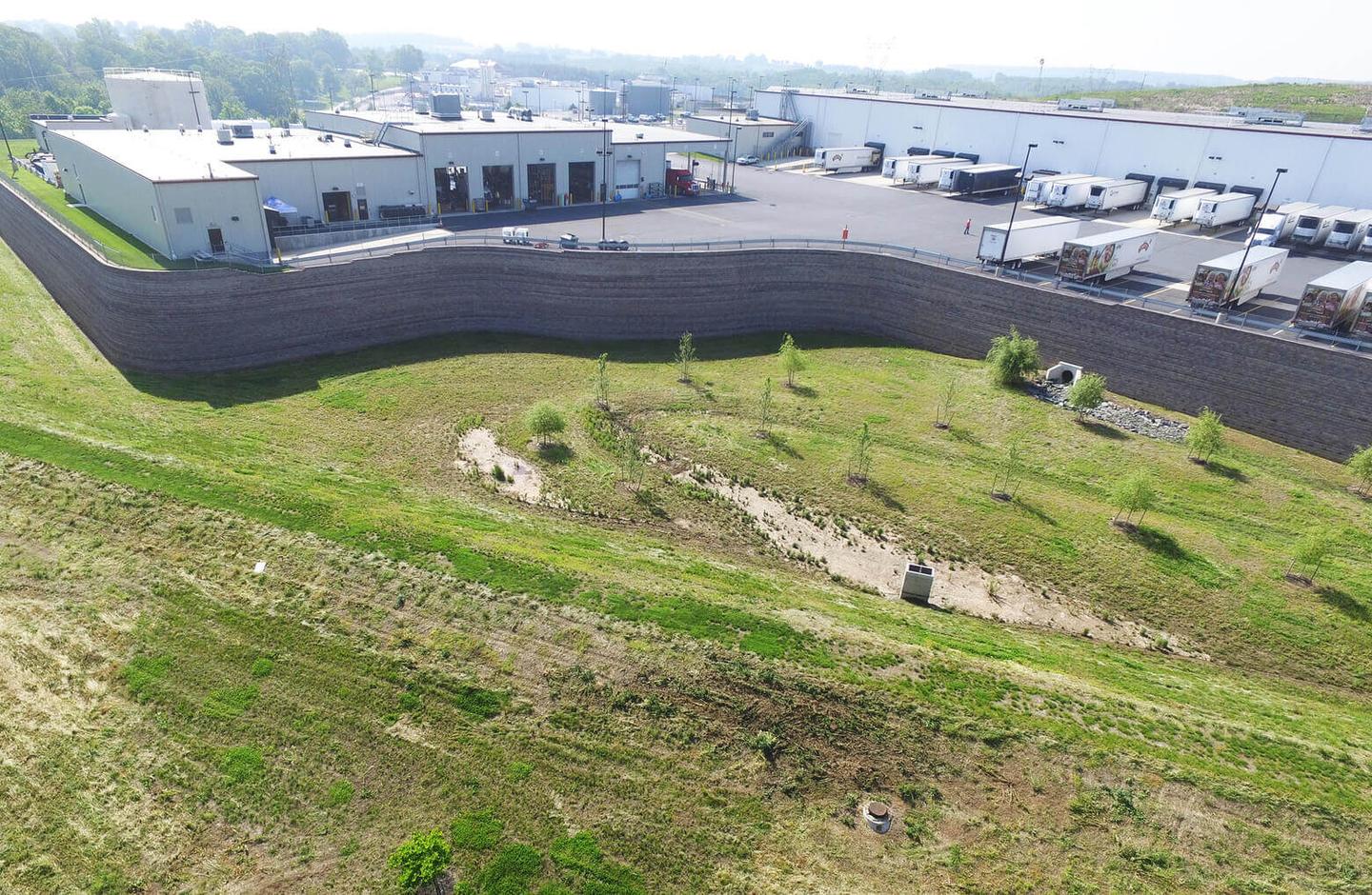 The buildings were required to have fire protection and there was no public water available. Greenfield designed a 300,000-gallon water storage tank for fire protection for all three buildings. The storage tank had to be located adjacent to and within 20' of the retaining wall. The design required a complete analysis of the owner's existing operations.